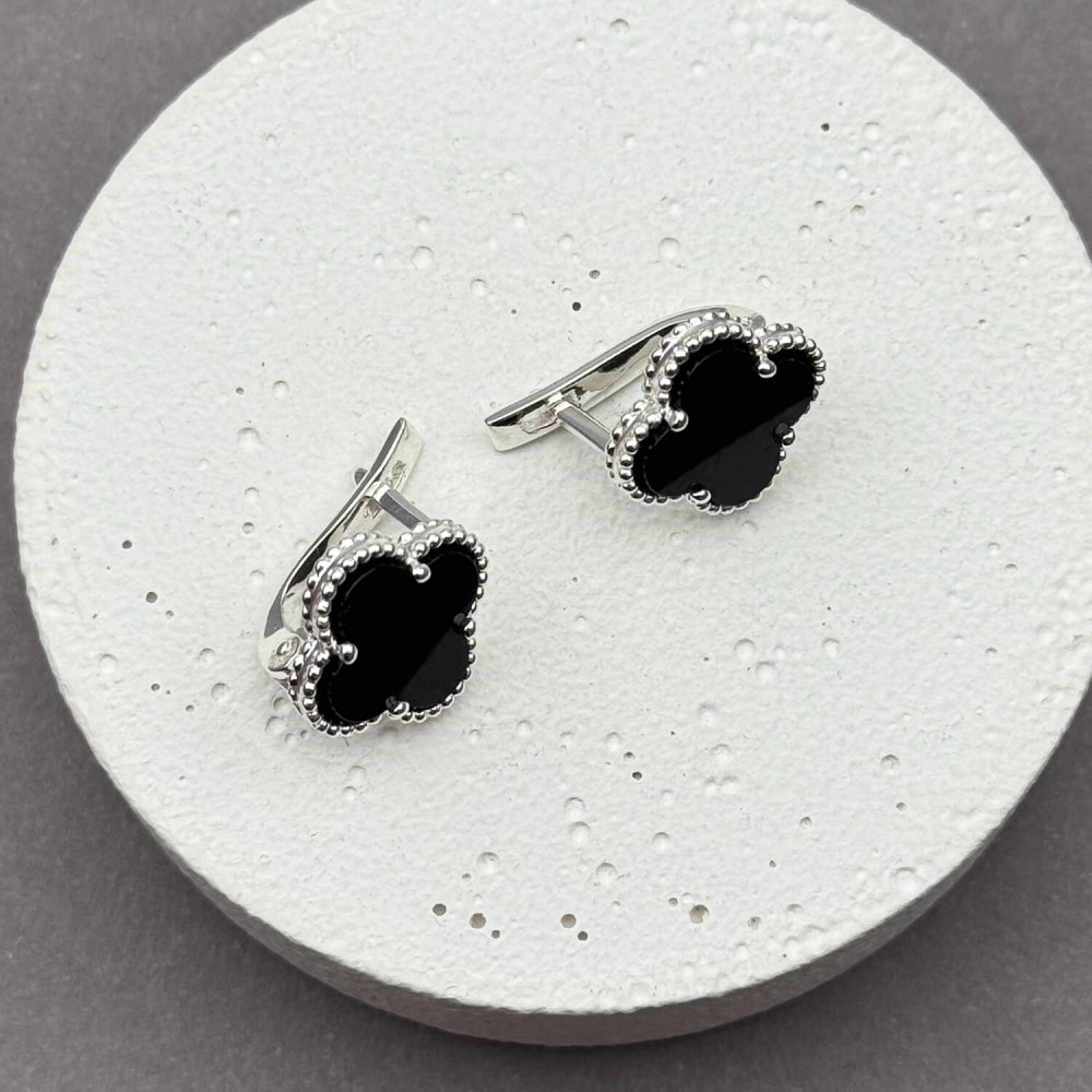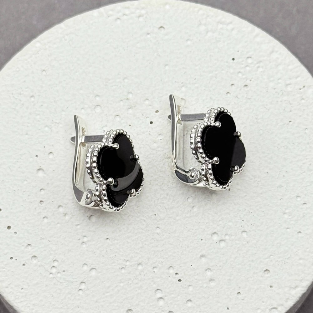 Серебряные серьги Клевер с ониксом. Артикул 009648
